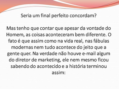 O gerente de marketing foi a segunda pessoa a manifestar uma opinião a respeito do e-mail, “meio sem tempo para ler tudo”, mas muito impressionado com os comentários da assistente, sem pensar duas vezes e ainda mais indignado, mandou a seguinte mensagem para o Gerente do Homem: